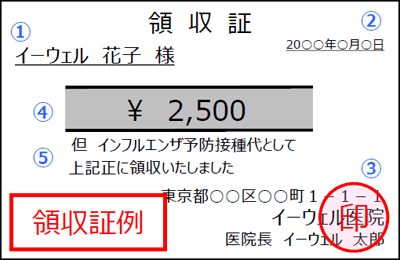 - 領収証は、件名、日付、金額、余白に予防接種を受けた全員の氏名とそれぞれの金額、および発行者名が記載された原本のみが有効となります(レシート、コピーは不可)。