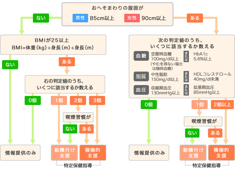 メタボリックシンドロームの該当者・予備群を見つけ、生活習慣改善のための保健指導(特定保健指導)が必要な人を抽出するための健診です。腹囲とBMIにより内臓脂肪の蓄積の程度を判断し、さらに血糖・血圧・血中脂質などの検査結果および質問票から追加リスクを評価して、保健指導が必要かどうかを判定します。